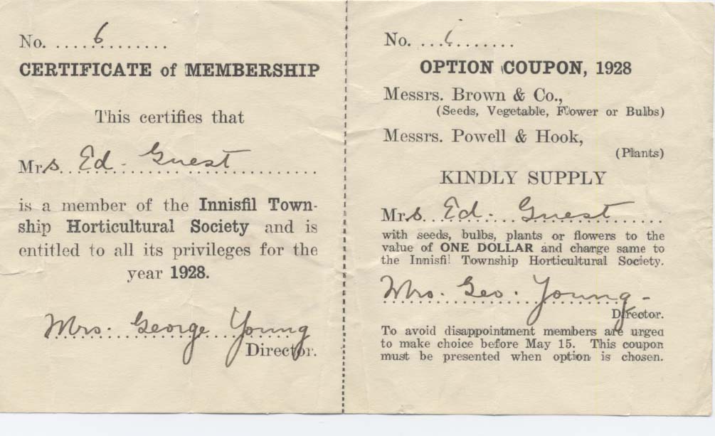 Copy of a "Certificate of Membership" in Innisfil Township Horticultural Society for the year 1928 given to Mrs. Edward Guest and authorized by the Society's director, Mrs. George Young. Beside the membership is an attached coupon redeemable for $1.00 worth of seeds, bulbs, plants, or flowers from Messrs. Brown & Company or Messrs. Powell & Hook to be repaid by the Society.