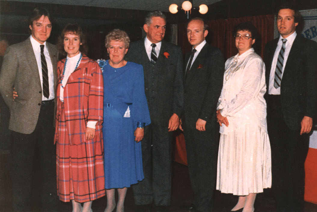 Colour photo of the Fisher Family on the occasion of Betty Fisher receiving the 1986 Citizen of the Year Award. Standing from left to right are Brent, Sandra, Betty, Stewart, Brian, Cathy, and Mark.