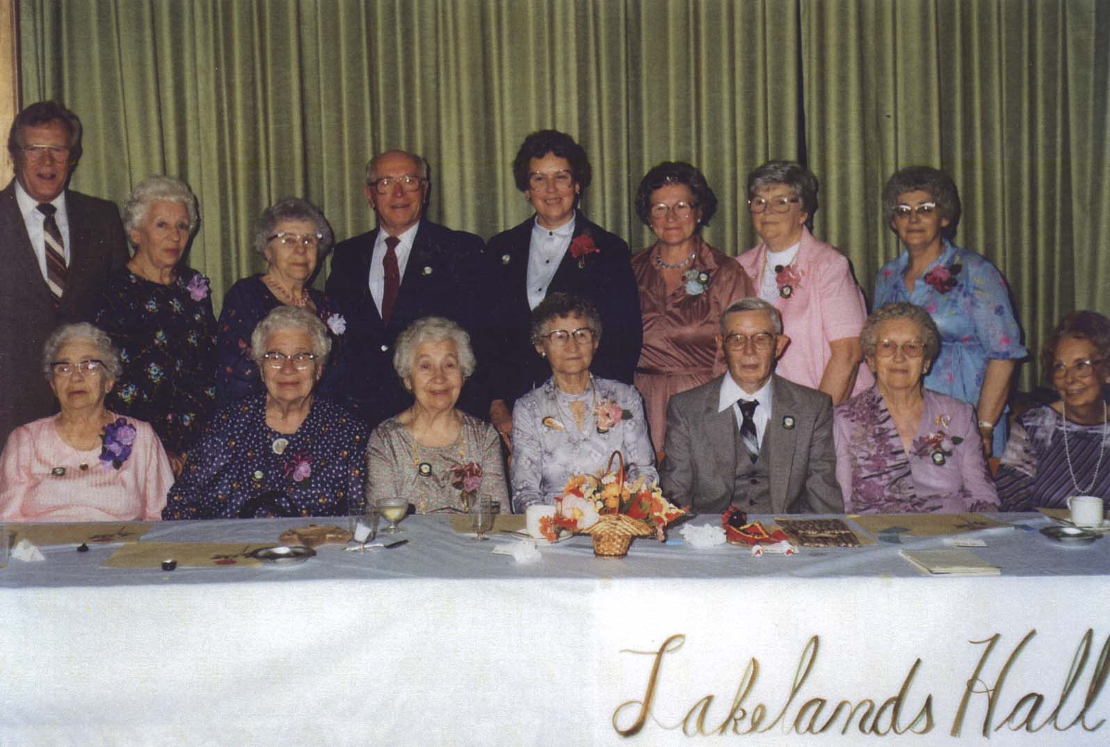 Image taken at an event for the 25th Anniversary of Lakelands Hall. Guests are pictured seated and standing behind what appears to be the head table at the event. The women in the image are wearing buttonhole flowers on their dresses, and the men are wearing suits with ties. Jack Webster was the guest speaker at the event. [Left to right] Back row: Jack Wood, Jessie Wood, Mrs. Henrietta Auchterlonie (also know as Reta), Jack Webster,Muriel Webster, Mary (Low)Grant, Dorothy Lea, Dorothy Wiggins. Seated: Bella Blakely, Mima Stewart, Mrs. Gardner, Mrs. Flegel, George Dietrich, Mrs. Dietrich, Helene Fisher.
