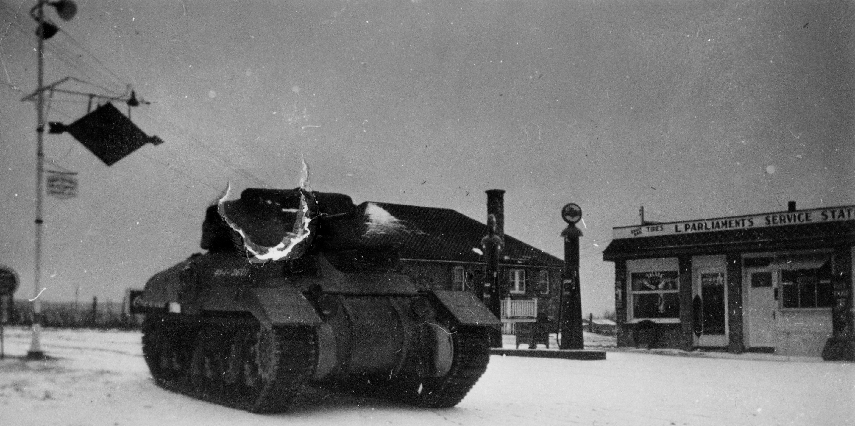 Photo of a Sherman tank in front of Parliament's Service Station, taken in 1940 during the Second World War. The army occasionally did training exercises in trucks and tanks over many miles of township roads in Essa, Innisfil, etc. This tank crew are getting warm and drinking coffee at the station.