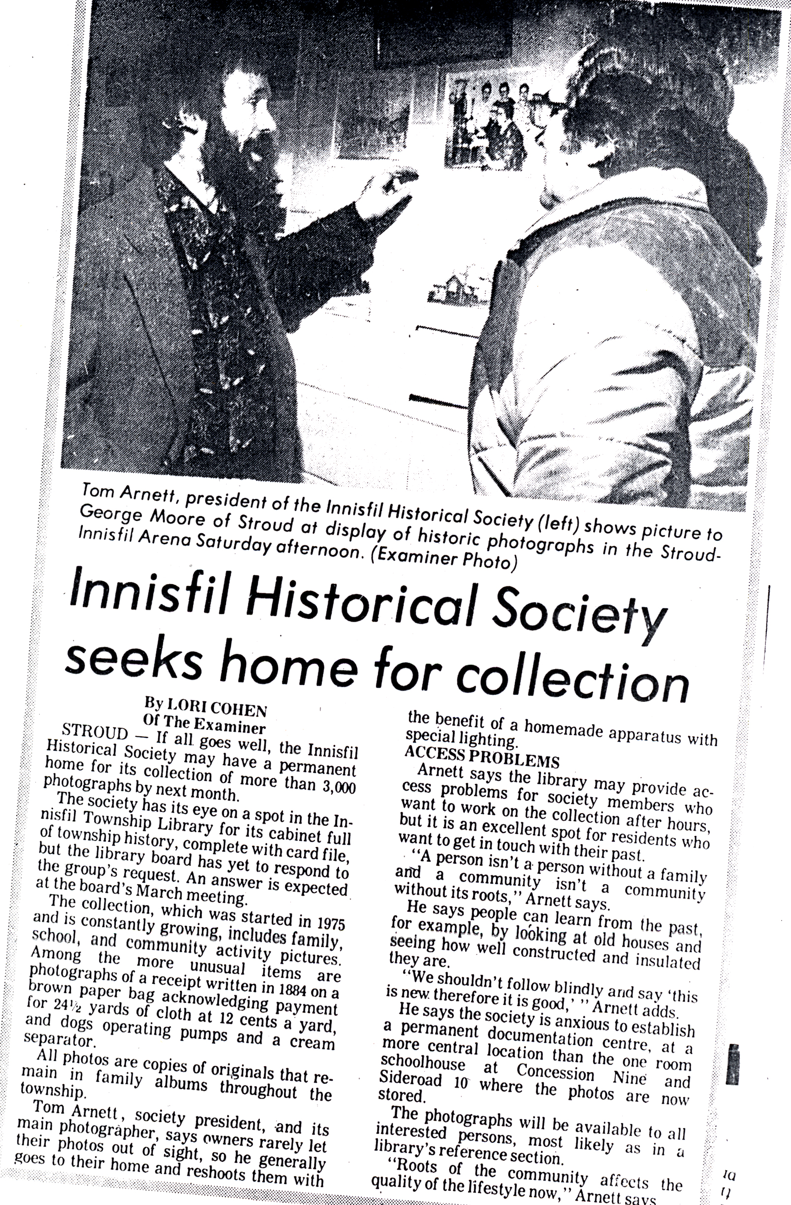 Copy of a newspaper clipping from the Barrie Examiner in 1980 entitled "Innisfil Historical Society seeks home for collection". The article details the Society's search for a permanent location to house its collection of copies of photographs, stating the the Innisfil Township Library may be selected, but the Library Board had not yet responded to the request. It also mentions that the location may present access problems for Society members who wish to work with the collection after hours, but that residents of the community would be well-served and it would be a great place to learn about their past. The article also includes a photograph of Tom Arnett, president of the Society, showing a photograph to George Moore of Stroud from a historical display in the Stroud-Innisfil arena.
