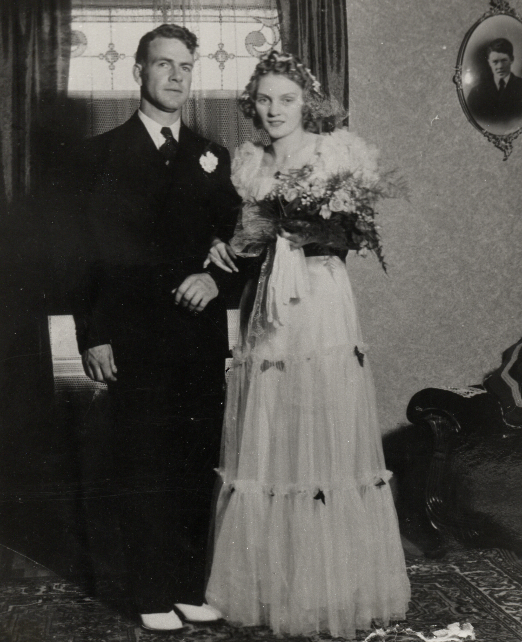 Wedding picture of Mr. and Mrs. Ray Johnston (nee Arvella Belfry). They lived on NH Lot 25, Conc. 10. Ray Johnston is the son of Edwin Johnston.