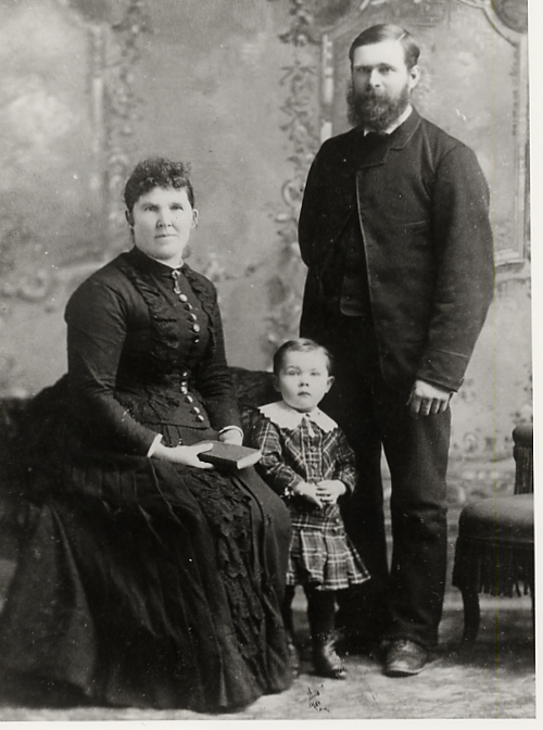 Portrait of Mr. George and Ellen (née Scott) Sharp with their son Scott at three years old. This photo was taken in King's Studio in Barrie in 1899.