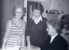 Preparing the wedding cake for serving at the open house - Alice Baker, Peggi Brown and Daureen Brown - June 1979.