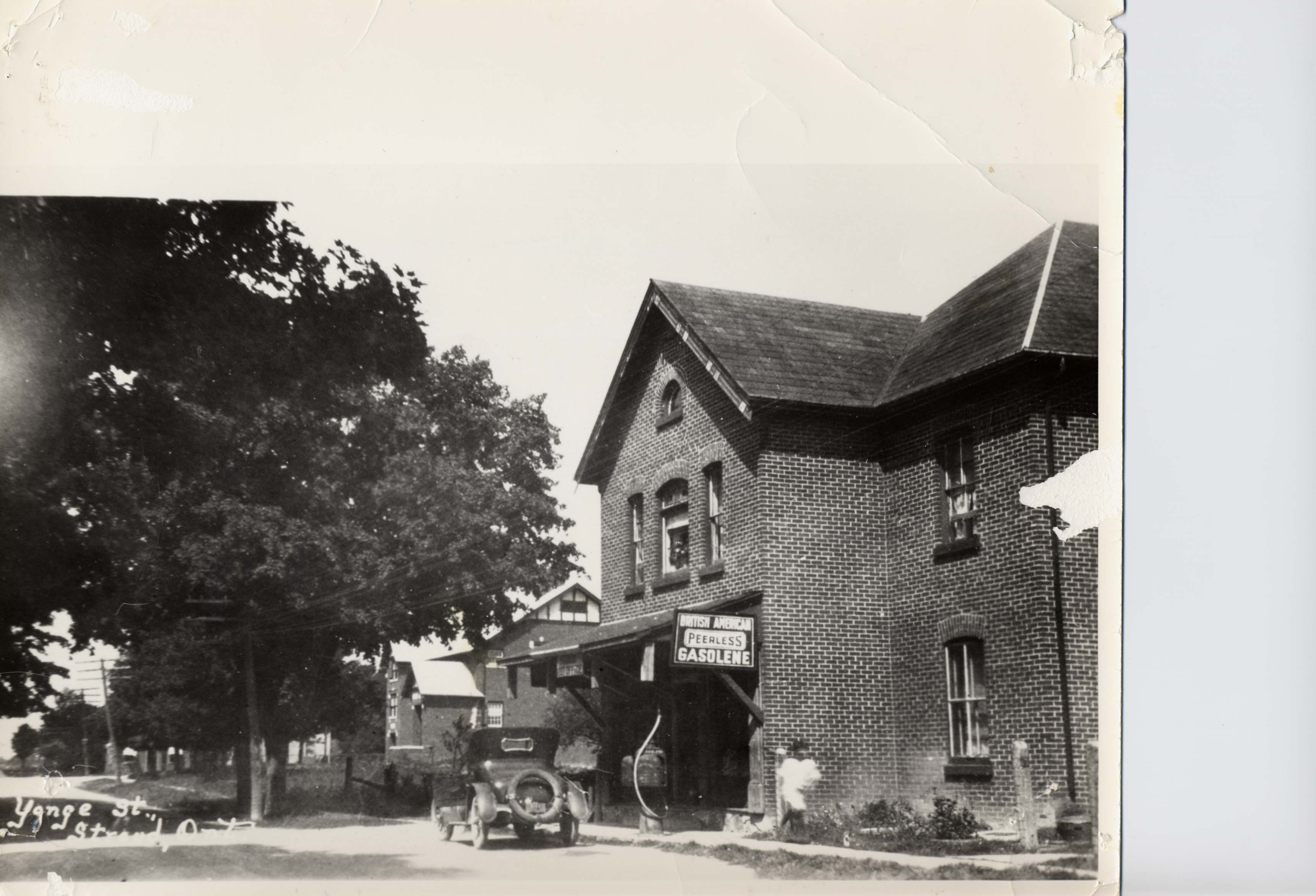 Store and gas pumps, Stroud. East side of Highway 11, looking north. Background school.