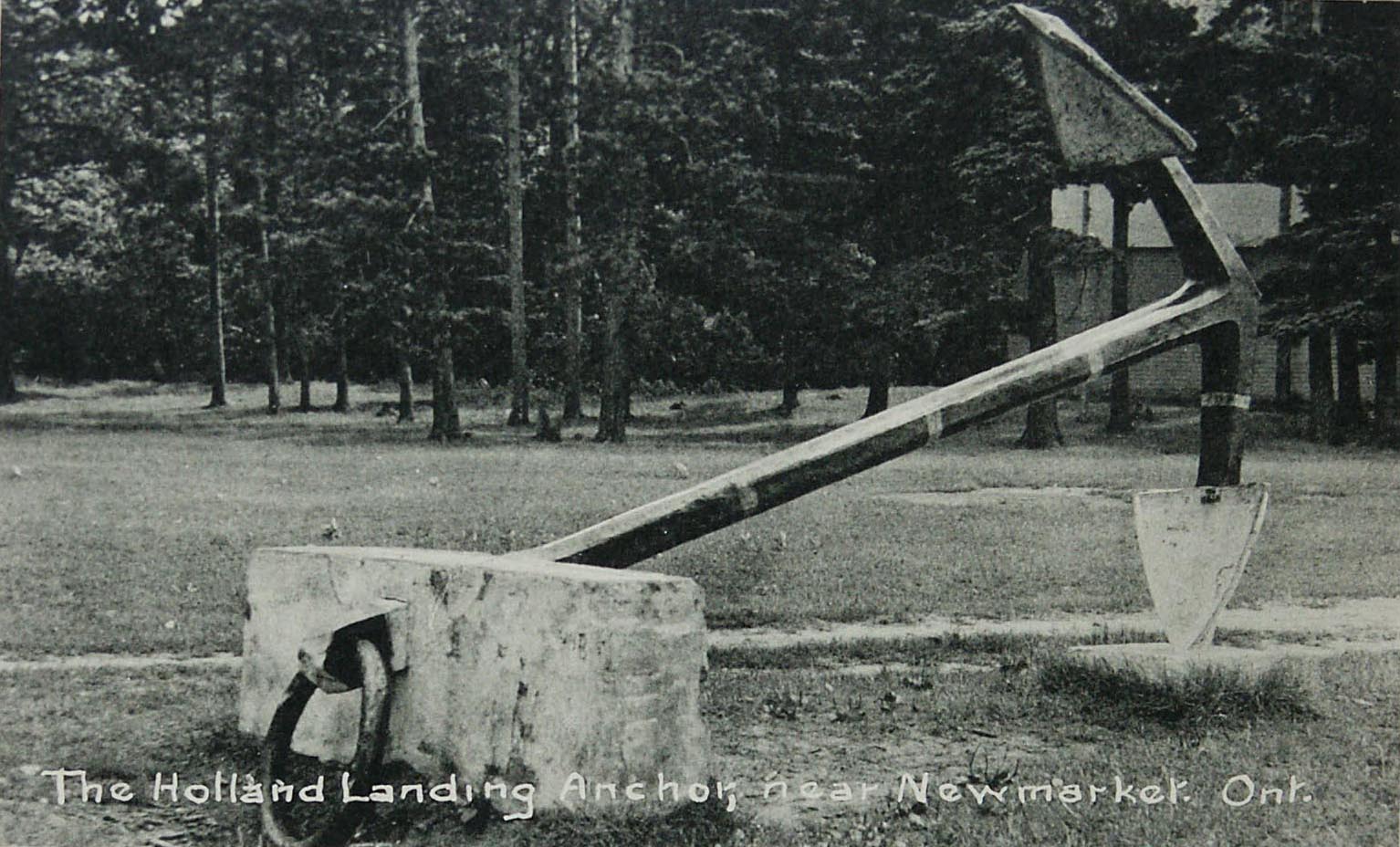 Photo of the anchor displayed at Anchor Park in Holland Landing. The anchor, which weighs approximately 4000 pounds, was forged in England for use on a frigate under construction in Penetanguishene at the time. However, the end of the War of 1812 came before the anchor could complete its journey, and was abandoned at Soldier's Bay. In 1870 it was brought to Holland Landing for display.