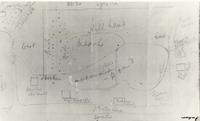 Hand drawn map of the Haughton sawmill including the shingle mill, millpond, dam, house, stable, and creek. The creek,