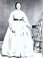 A studio portrait taken of Ann Fraser in 1870. She is posed standing with her hand rested on a chair. Her hair is up,, IHS1295