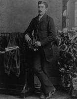 Studio portrait of James Alexander Jamieson, who was Neville Jamieson's father. He is standing beside a piano and, IHS1741