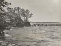 Photograph of the breakwater in Lake Simcoe at Belle Ewart. The water is calm and there are some buildings visible along, IHS419