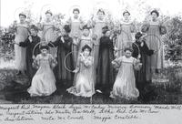 A group of young women performing a dance or a drill. The names of the young women are on the photograph,, IHS4344