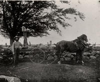 Photo of Isaac Spring II clearing stones with a wagon and team of horses., IHS1128