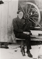 Photo of Claude Sloan sitting in his father's (R.W. Sloan) Carriage and Paint Shop., IHS532