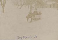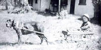 Photo of Ward Goodfellow as a toddler in a wagon being pulled by his dog. A special harness to fit the large dog's, IHS153