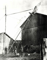 Erection of a windmill on home farm of David Allen, Lot 7, Concession 7. Small Boy at left is Hartly Allen with father, IHS1143
