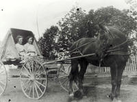Photo of Lillian Sproule (left) and Amy Haughton (right) riding in a horse and buggy with top down. Both women are in, IHS959