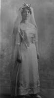 Mrs. Howard Allan, nee Edna Sturgeon, on her wedding day February 6, 1913. Her wedding dress has been donated to the, IHS1636