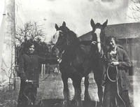 Eva Whan, Zella Reid holding 2 of Beatty's Clydesdales., IHS2758