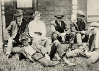 Standing in front of the house, left to right are Margaret Neilly, Alzada Neilly, Mr. George Neilly, Donald Barnes, and,