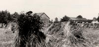Photo from 1916 of two large stooks of grain, made by a horse-drawn binder, standing in a field before collection. A man, IHS1032