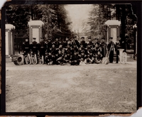 Photograph of the Thornton Band standing in front of gates after winning first prize at the Canadian National Exhibition
