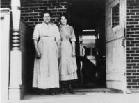 Image taken of two women standing on their porch outside their house, taken in 1916. Annie Jack stands on the right in, IHS880
