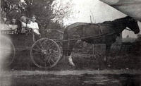 Photo of the Donnelly family in a two-seater Democrat, a type of horse-drawn carriage. Pictured in the back seat from, IHS591