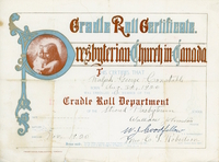 Colour Scan of the Cradle Roll Certificate through the Presbyterian Church in Canada for Ralph George Constable. The
