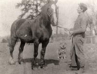 Thomas Donnelly with his horse on the Donnelly Farm - 4th Line, Lefroy. The old dog in the photo was named Nellie., IHS588