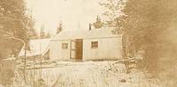 Photo of a hunt cabin located at Pipe Lake, taken in 1920. The photo shows a small structure with two small windows on,