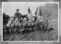 A black and white image taken in 1929 on Dave Cochrane's farm. The image features a wagonload of bags filled with grain., IHS3920