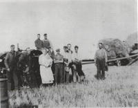 Black and white image of a group of people threshing at Dave Cochrane's farm, taken in 1929. The group is standing in, IHS3918