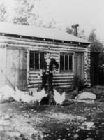 Mr. Fred Quantz in front of his first garage, it was made out of logs, was on the 5th line, Lot 23, Bell Ewart., IHS662