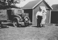 Image taken in 1933, of Percy and Bertha Thompson standing with their car. They are standing outside of their car, while, IHS3695