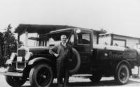 Image of Art Pugh taken in 1933. He is standing in from of a 'Premier Gasoline' truck, said to be delivering gas from, IHS1831