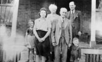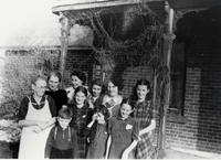 Outdoor group photo of various members of the Irving family standing in front of the porch of a brick house. Pictured, IHS2378-G