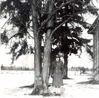 Photo of a young girl identified as Flo standing under some trees at Alcona Beach in 1944.