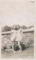 Photo of two young girls identified as Flo and Shirley standing in front of a stone wall in Innisfil Park in 1944.