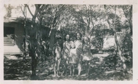 Photo of five children - Jim, Gladys, Shirley, Lil, and Flo - amongst trees at Innisfil Park in 1944. A small cottage is