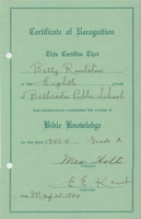 Certificate of Recognition issued to Betty Roulston [later Betty Coburn] that reads: "This certifies that Betty Roulston