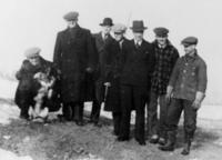 Outdoor photograph of several members of the Irving Family standing in woolen coats and hats. Pictured from left to, IHS2379
