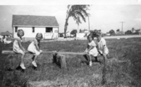 Photo of Robert James and Heather Gail, children of Albert and Betty Cheesman, feeding chickens behind Meadowbrook,