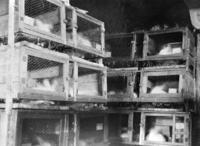 Jean Saunter's Angora rabbits in hutches. She plucked the wool, spun it and knitted it into mitts, gloves and tams, IHS1662
