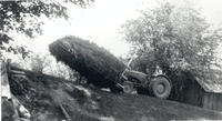 Photo of a buckrake in use on the Harold Wallace farm. Buckrakes were a type of hay rake designed to travel along a hay, IHS1912
