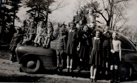 Black and white photo of a large group of children posing in front of Byron Grose's car in approximately 1948. Pictured