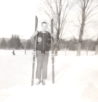 Partially faded black-and-white image of Blake Constable, in his early twenties, posing with a pair of skis. Trees are