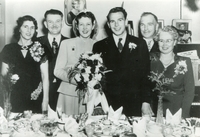 Photograph taken during the wedding of Margaret Chalmers and George Young on 7 February 1948. Pictured from left to