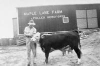 Photo of Roy Goodfellow in 1948 standing with one of his prize Hereford Cattle, characterized by its brown body and, IHS3336