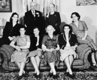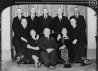 Portrait of the Irwin family taken in their home in front of a curtain. The men are all dressed in dark suits and the, IHS2624