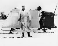 Airplane Motor driven Snow Sled made by Mr. Harold Shepard. Mr. Percy Pearson from Toronto, in front of machine, IHS692